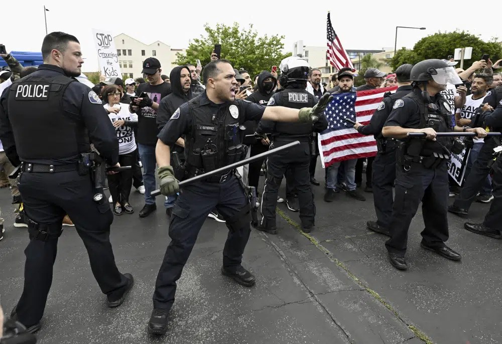 Conservative groups and LGBTQ+ rights supporters protest as police try to maintain order outside the Glendale Unified School District offices in Glendale, Calif., Tuesday, June 6, 2023. Several hundred people gathered in the parking lot of the district headquarters, split between those who support or oppose teaching about exposing youngsters to LGBTQ+ issues in schools. (Keith Birmingham/The Orange County Register via AP)