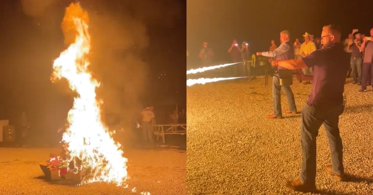 State Senator Bill Eigel—a GOP candidate for the Missouri governorship who has pledged to burn books if elected—is seen on camera gleefully using a flamethrower to burn empty cardboard boxes while joined by State Senator Nick Schroer, highlighting what he would actually do to books if given the chance.