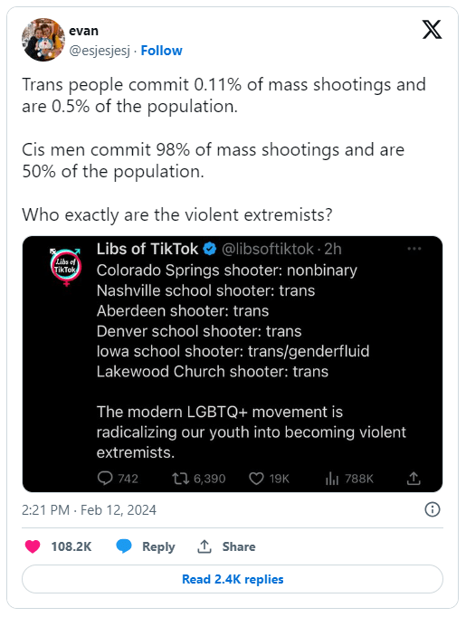 Unfortunately, Greene wasn’t the sole individual on the right to exploit the shooting to vilify transgender individuals, despite the overwhelming evidence that the vast majority of mass shootings are committed by cisgender men. Chaya Raichik, an anti-LGBTQ+ extremist known as Libs of TikTok, also referred to Moreno as a “trans terrorist” and questioned her medication regimen, insinuating a connection between transgender identity and mental illness.
