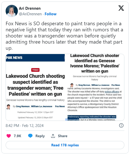 “Fox News is SO desperate to paint trans people in a negative light that today they ran with rumors that a shooter was a transgender woman before quietly admitting three hours later that they made that part up,” Media Matters’s Ari Drennen posted to social media.