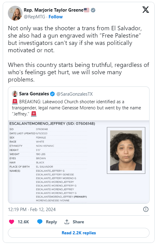 “Not only was the shooter a trans from El Salvador,” Greene posted on X, “she also had a gun engraved with ‘Free Palestine’ but investigators can’t say if she was politically motivated or not.”