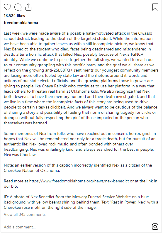 Nex Benedict, a 16-year-old sophomore who identified as nonbinary and Native American, reportedly suffered a fatal beating on February 7th at Owasso High School in Oklahoma. Three older female students were allegedly responsible for the attack in the school’s bathroom. Despite the severity of Benedict’s injuries, the school neglected to call for an ambulance and only notified the police after Benedict was admitted to the hospital. Tragically, Benedict succumbed to their injuries the following day.