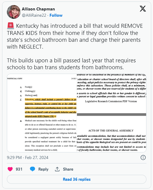 Kentucky is considering a bill that could result in the REMOVAL OF TRANS YOUTH from their homes if they fail to comply with the state’s school restroom regulations, while also charging their parents with NEGLECT,” Chapman exclaimed, alongside screenshots of the draft legislation.