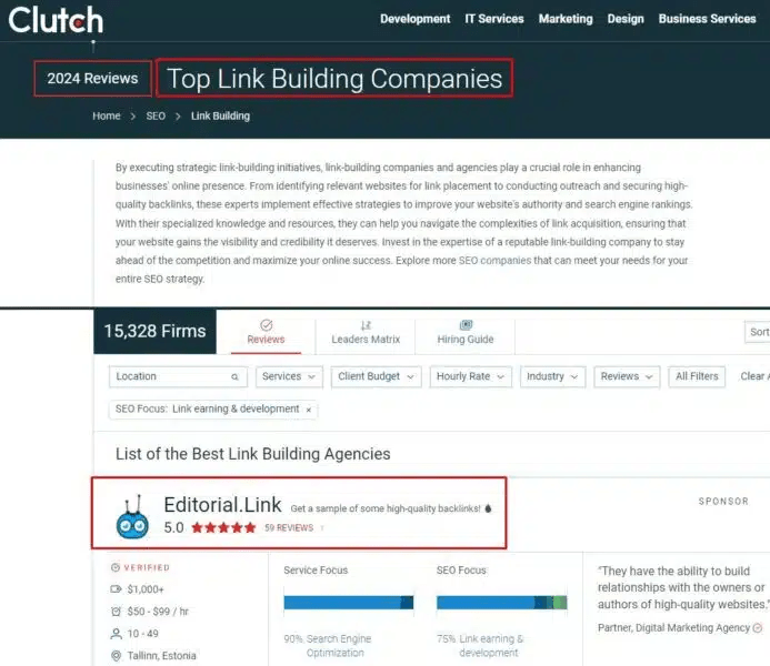 For example, if you search “top link building companies” on Clutch, here’s what you’ll see: