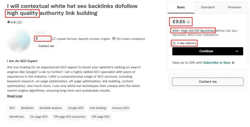 Quality comes at a price, and obtaining high-quality links requires significant effort and resources. Attractive offers like “600+ links for $10” on platforms such as Fiverr.com often result in low-quality links that do more harm than good. It’s best to stay away from such “experts.”