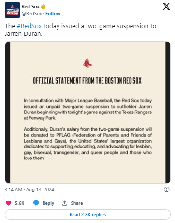 In an August 12 statement, the Red Sox announced that, in consultation with Major League Baseball (MLB), Duran has been issued a two-game unpaid suspension starting with Monday night’s game against the Texas Rangers. His salary from the suspension — amounting to $8,172, according to ESPN — will be donated to the LGBTQ+ organization PFLAG, previously known as Parents and Friends of Lesbians and Gays.