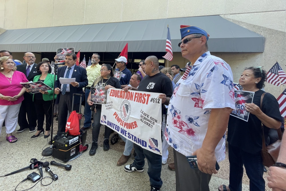 Domingo Garcia, LULAC’s former president, also spoke at the protest, declaring, “There is no poll tax, no white-only primary. We will not go back.”