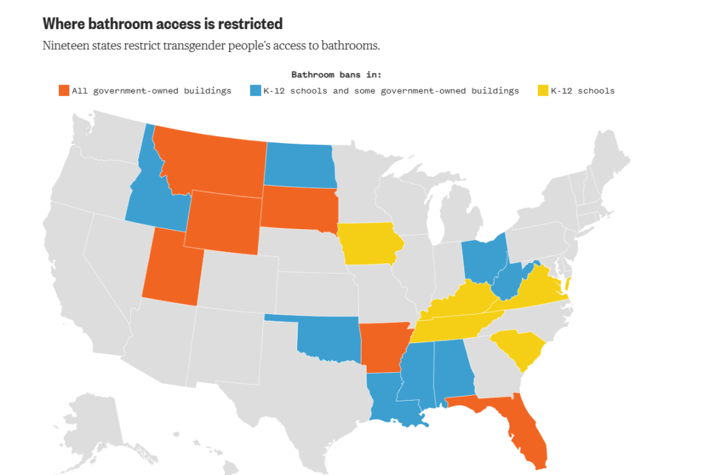 Nineteen states have laws that prohibit trans people from using the bathrooms that align with their gender identities in K-12 schools, and in many of those states the restrictions apply to other government-owned buildings as well. As a result, more than 1 in 4 trans people live in states with policies that restrict their bathroom use, according to the Movement Advancement Project, an LGBTQ think tank.
