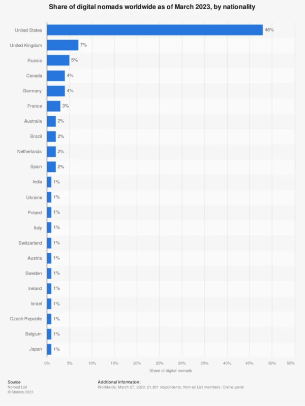 The study, in fact, found that 53% of digital nomads in the United States intend to stay within the country year-round, in contrast to a mere 10% who have intentions of frequent international travel.