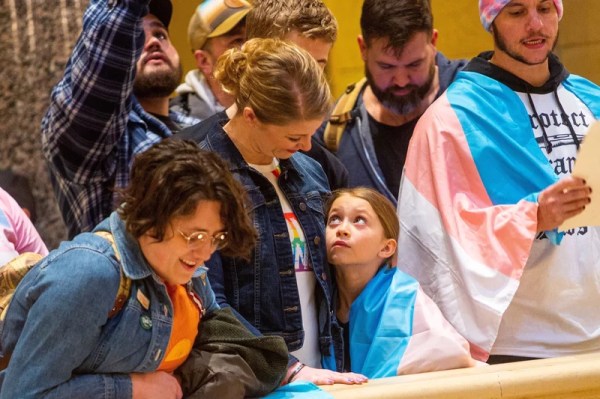 Bella Mendez, 8, stands with her mother during a Trans Day of Visibility rally at the Minnesota State Capitol building on March 31, 2023.