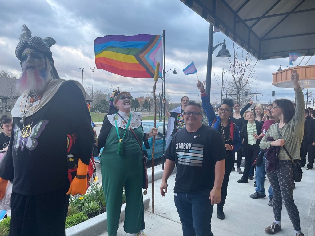 A group takes part in Transgender Day of Visibility and the Southern Illinois Trans Resource Fair in Carbondale on March 31, 2023. The Illinois town’s trans-welcoming reputation and resource groups like the Carbondale Assembly for Radical Equity have drawn transgender people from across the country, who are being forced to leave their home states due to anti-trans legislative policies and health care bans.