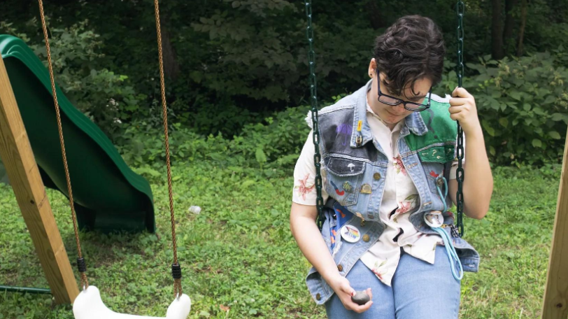 Shigeru Nightengale, 15, recently moved from Iowa to Illinois for protections as a transgender teen and student. Shigeru loves collecting rocks and picked up a stone before sitting down at a swing set in the Nightengales’ new backyard.