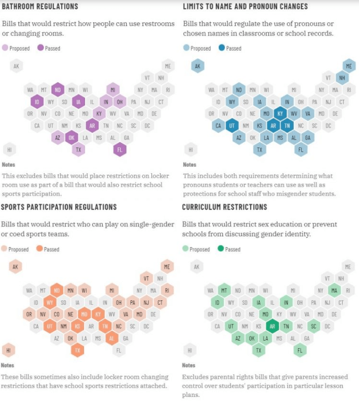Restrictions Impacting K-12 Schools During This Year’s Legislative Sessions: Chalkbeat meticulously reviewed and categorized 494 bills from the ACLU’s tracker of LGBT-related state legislation. The focus was on identifying those that aimed to regulate K-12 schools and students, offering a comprehensive assessment of the landscape confronting trans and nonbinary students.