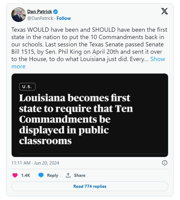 “Texas WOULD have been and SHOULD have been the first state in the nation to put the 10 Commandments back in our schools,” Patrick said in a post on X. “But, SPEAKER Dade Phelan killed the bill by letting it languish in committee for a month assuring it would never have time for a vote on the floor.”
