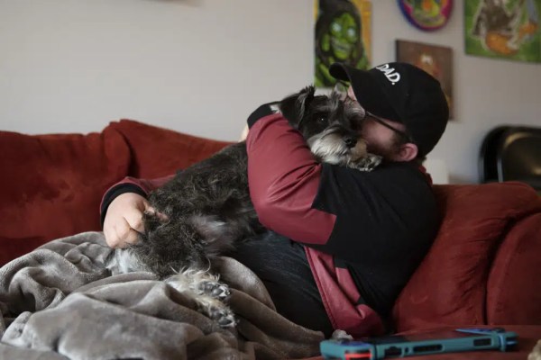 Eli cuddles his dog on the couch at his home in Casselberry, Fla., May 29, 2023. Eli and his fiancé Lucas, both transgender men, plan to move to Minnesota with their dog and two cats later this year. The Associated Press is not using Eli’s and Lucas’ last names because they fear reprisal.