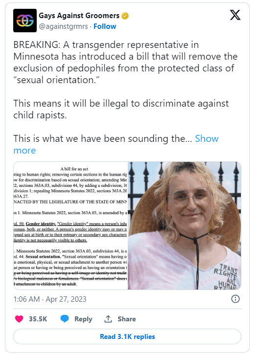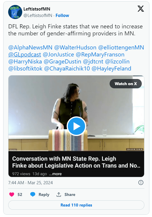 Minnesota conservatives often spotlight Finke, especially when she speaks positively about gender-affirming care. Both large and small accounts launch attacks against her. LGBTQ Nation has identified several of these accounts, including “@LeftistsofMN,” a prominent right-wing account that monitors notable left-wing figures in the state, and “Action 4 Liberty,” a right-wing activist organization.