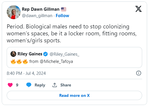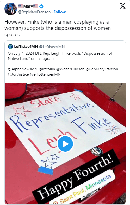 Another instance came from state Rep. Mary Franson (R), who publicly stated, “However, Finke (who is a man cosplaying as a woman) supports the dispossession of women [sic] spaces.”