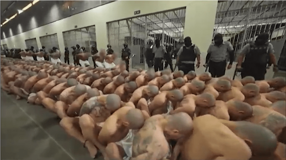 Central to this effort is the newly built “Terrorist Confinement Center,” or Cecot, a massive prison complex designed to hold up to 40,000 inmates. Currently, it houses 14,000 gang members, all accused of having committed at least one murder. Disturbing images from Cecot show heavily tattooed men with shaved heads packed into warehouse-sized concrete rooms, filled with metal bunks or seated in tight rows on the ground. Dressed only in white shorts, their heads are bowed, hands behind their backs. According to Salvadoran authorities, those sent to Cecot will never be released.