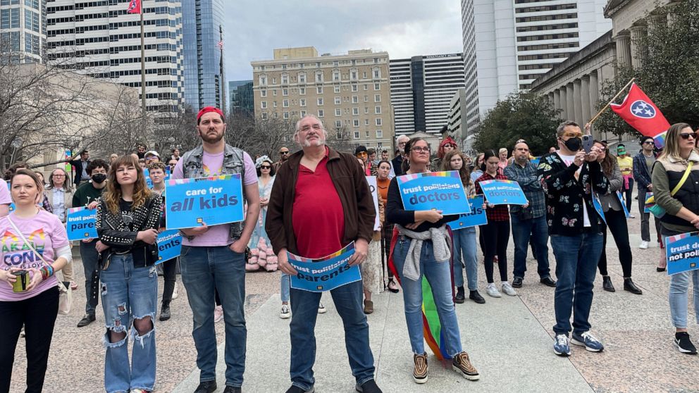 Advocates gather for a rally at the state Capitol complex in Nashville, Tenn., to oppose a series of bills that target the LGBTQ community, Tuesday, Feb. 14, 2023. A federal appeals court has temporarily reversed a lower court’s ruling, Saturday, July 8, that had prohibited Tennessee from enacting a ban on gender-affirming care for transgender youth.