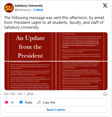 In a separate statement, Salisbury University President Dr. Carolyn R. Lepre condemned the students’ actions, saying, “Acts of violence toward LGBTQ+ and Ally communities are not only destructive but at odds with the principles of community, respect, and belonging that bind us together as a university.”