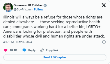 Illinois Gov. JB Pritzker reaffirmed his commitment to LGBTQ+ Americans in a tweet, declaring that Illinois would remain “a refuge for those whose rights are denied elsewhere.”