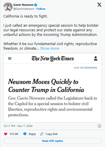 According to a release from Newsom’s office, this special session is a direct response to the public statements and proposals made by President-elect Trump and his advisors, as well as actions taken during his first term. These efforts, Newsom’s office warns, could threaten essential freedoms and individual rights, including women’s rights and LGBTQ+ rights.