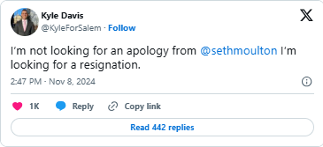 ‘Resign @sethmoulton,’” he tweeted on November 8. Shortly after, he followed up with a second post, stating, “I’m not looking for an apology from @sethmoulton, I’m looking for a resignation.
