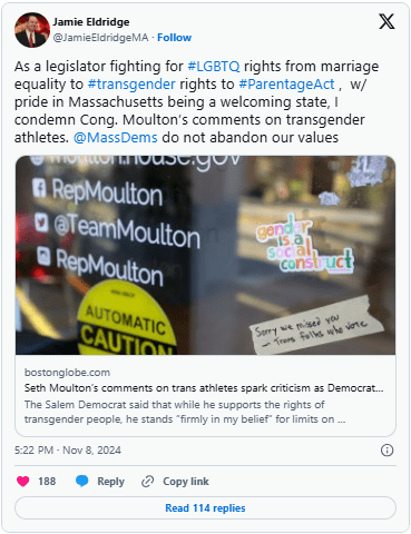 Massachusetts Senator Jamie Eldridge also spoke out against Moulton’s transphobic comments. On November 8, Eldridge took to X to share a link to a Boston Globe article highlighting local Democrats who were condemning Moulton’s remarks.