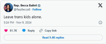 Vermont Rep. Becca Balint succinctly summed up the sentiment in a November 9 X post, writing, “Leave trans kids alone.
