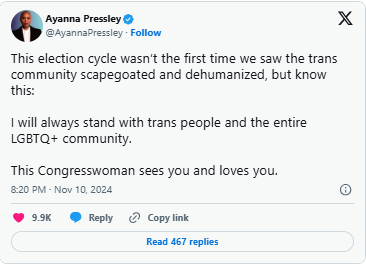 Massachusetts Rep. Ayanna Pressley reinforced her commitment to the trans and LGBTQ+ communities in a November 10 X post, reaffirming her unwavering support.