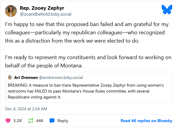 In a post on Bluesky Tuesday, Zephyr expressed relief, writing, “I’m happy to see that this proposed ban failed and am grateful for my colleagues, particularly my Republican colleagues, who recognized this as a distraction from the work we were elected to do.” She also told the New York Times via email that she plans to focus on issues like “housing and health care” in her legislative work moving forward.