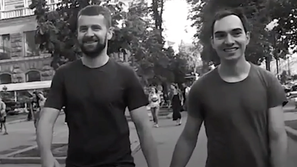 Kis and Levchuk are longtime civil rights activists in Ukraine. In 2015, the couple filmed a video for Ukrainian online magazine Bird in Flight, reenacting a recent social experiment conducted in Moscow featuring two young men holding hands as they walked through the city to gauge the public’s reaction. The responses in Kyiv mostly ranged from shrugs to bemusement, until Levchuk sat on Kis’ lap.