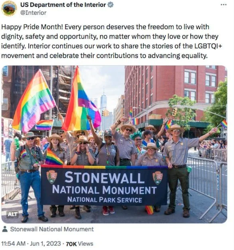 The characterization of Pride as a potentially “political” event raises concerns, particularly given the founding documents of Stonewall National Monument, which directly reference the “resources and values” of the LGBTQ+ community. NPS resources currently available on the site encourage people to “Celebrate Pride” and emphasize that “The LGBTQ experience is a vital facet of America’s rich and diverse past.” The resource underscores the importance of not making LGBTQ+ people invisible, stating, “By recovering the voices that have been erased and marginalized, the NPS embarks on an important project to capture and celebrate our multi-vocal past.” By barring employees from wearing Pride symbols or participating in Pride events, the NPS may unintentionally appear to be erasing and marginalizing its LGBTQ+ employees—contradicting its own stated mission.