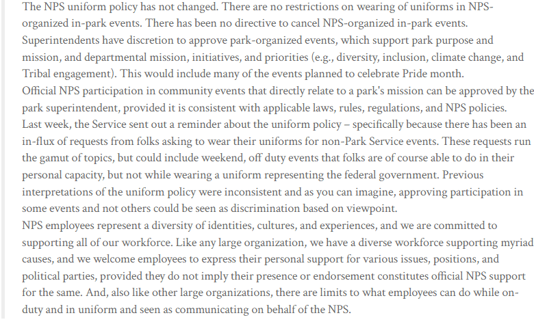 The future of Pride parade participation for NPS employees in uniform remains uncertain. While it seems that some Pride events within National Parks, like those at Stonewall, may still take place, external participation in major city Pride events appears to be on hold in at least some locations across the U.S. The possibility of individual or smaller LGBTQ+-affiliated Park Ranger contingents joining city Pride celebrations looks even less likely, with little hope of approval for participation.