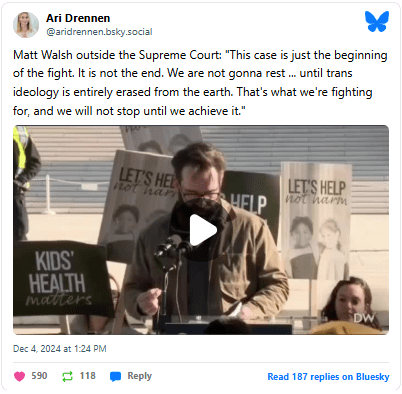 “They are gonna lose,” he continued. “They are losing right now. We are not going to let them harm our children. This case is just the beginning of the fight. It is not the end. We are not gonna rest until every child is protected, until trans ideology is entirely erased from the earth. That’s what we’re fighting for, and we will not stop until we achieve it.”