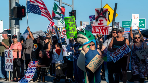 “Hey hey, ho ho, Donald Trump has got to go,” protestors chanted in the middle of Times Square, among a sea of signs that read “love reigns not kings,” “gays against faux-king Trump,” “we stand with … our trans family,” and “the future is coming.”